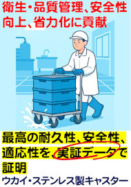 ウカイ・ステンレス製キャスターの耐久性、安全性、適応性について特長と実証で説明
